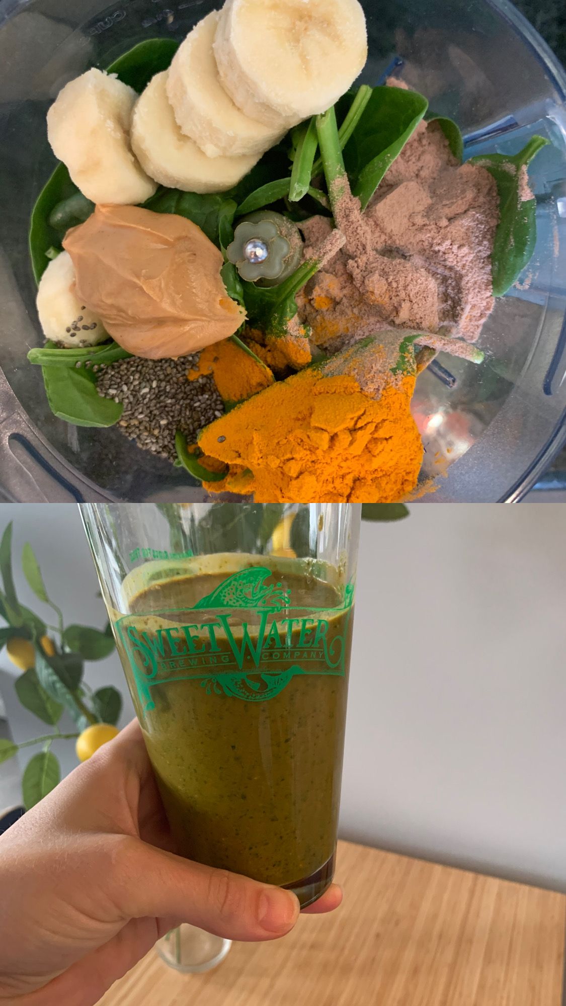 Then I concoct my breakfast smoothie which is a bunch of baby spinach, one scoop of Onnit protein powder, 1/2 frozen banana, 1 tablespoon of turmeric powder, 1 tablespoon of chia seeds, and about 1/2 - 1 cup of almond milk. I also typically add 1 tablespoon of peanut butter because we all know peanut butter makes life better. Blend that and boom - if your shake doesn't look like suspicious baby food, you're doing it wrong. Yes, I drink it out of a pint glass from my favorite brewery.